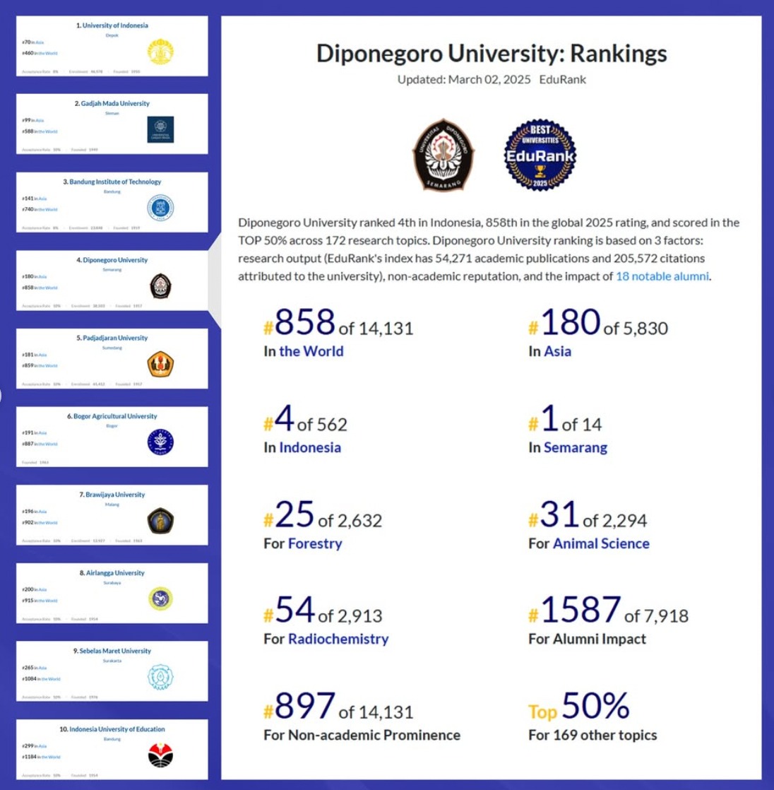 Pemeringkatan terbaru oleh EduRank yang dirilis 2 Maret 2025, memposisikan UNDIP pada peringkat ke-4 di Indonesia dan peringkat ke-180 di Asia.